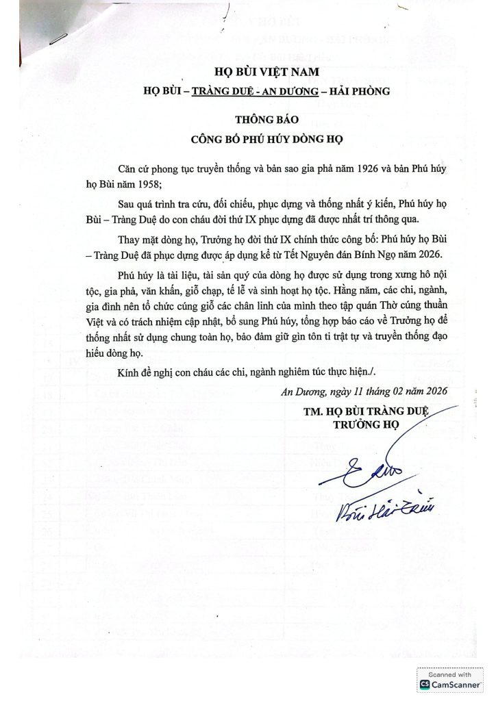 THÔNG BÁO – Công bố phú húy dòng họ (11/02/2026)